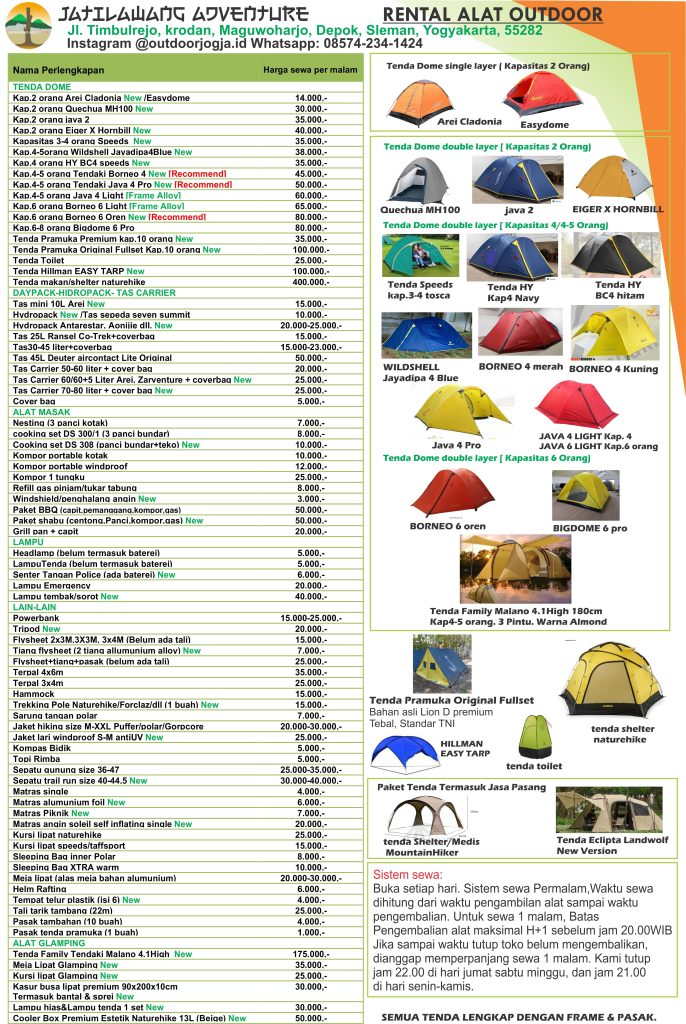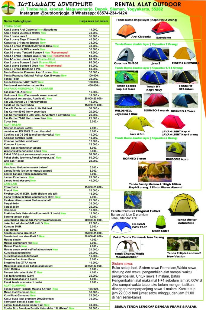 Pricelist sewa alat camping